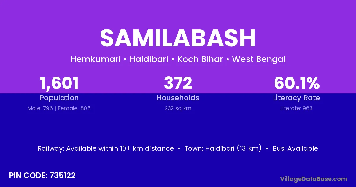 Haldibari (13 km) is the nearest town to Samilabash village for major economic activities and is located approximately 13 km away.