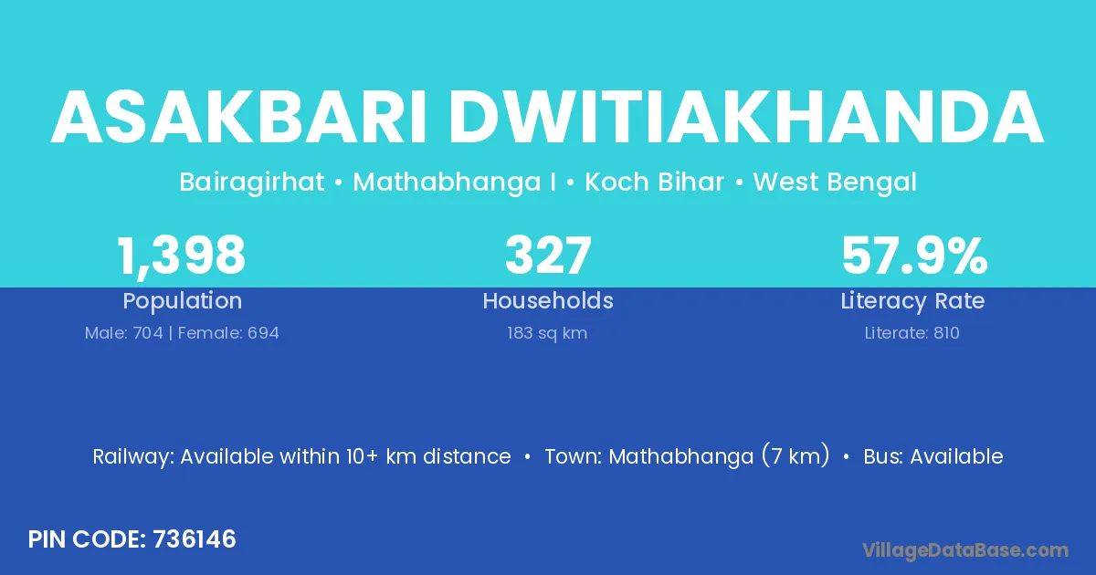 Mathabhanga (7 km) is the nearest town to Asakbari Dwitiakhanda village for major economic activities and is located approximately 7 km away.