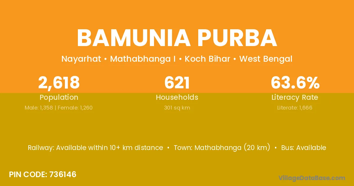 Mathabhanga (20 km) is the nearest town to Bamunia Purba village for major economic activities and is located approximately 20 km away.