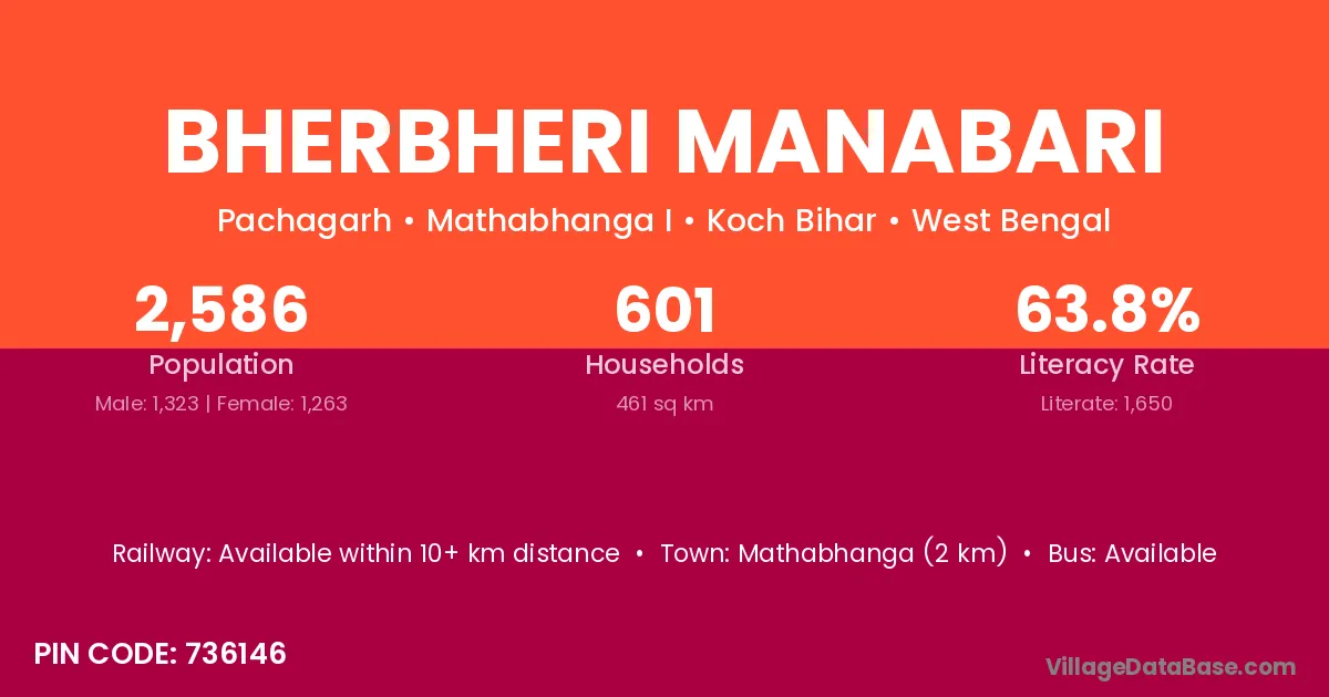 Mathabhanga (2 km) is the nearest town to Bherbheri Manabari village for major economic activities and is located approximately 2 km away.