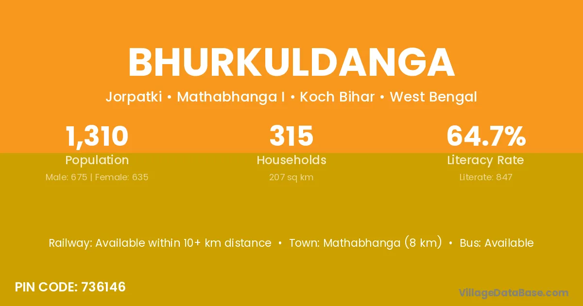 Mathabhanga (8 km) is the nearest town to Bhurkuldanga village for major economic activities and is located approximately 8 km away.