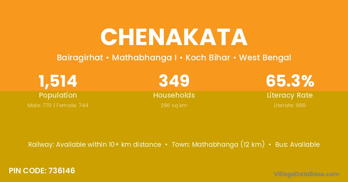 Mathabhanga (12 km) is the nearest town to Chenakata village for major economic activities and is located approximately 12 km away.