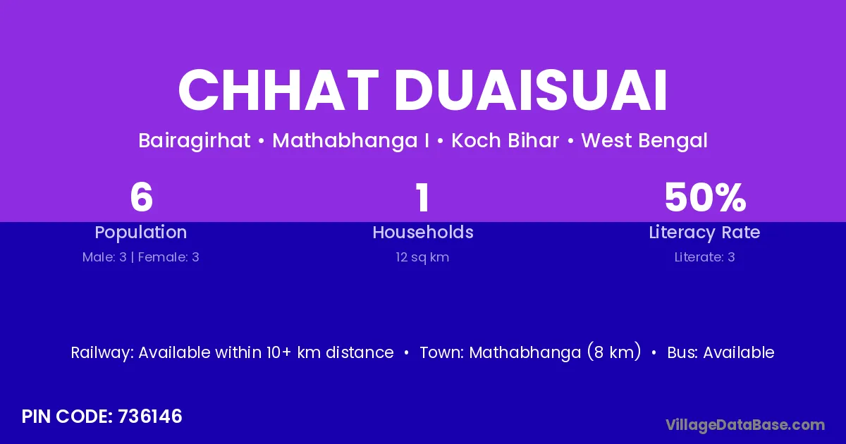 Mathabhanga (8 km) is the nearest town to Chhat Duaisuai village for major economic activities and is located approximately 8 km away.