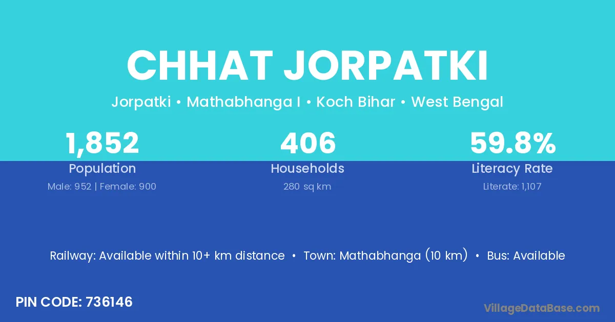 Mathabhanga (10 km) is the nearest town to Chhat Jorpatki village for major economic activities and is located approximately 10 km away.