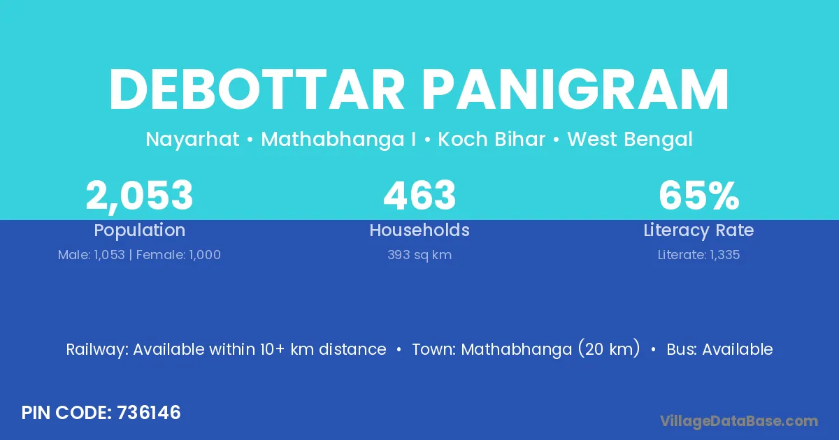 Mathabhanga (20 km) is the nearest town to Debottar Panigram village for major economic activities and is located approximately 20 km away.