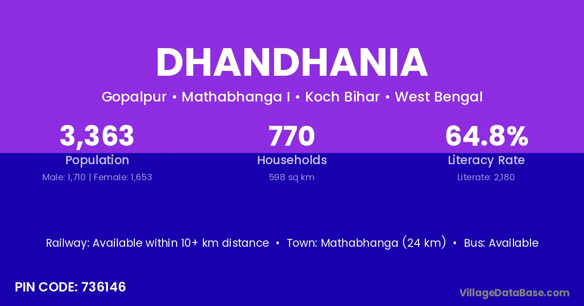 Mathabhanga (24 km) is the nearest town to Dhandhania village for major economic activities and is located approximately 24 km away.