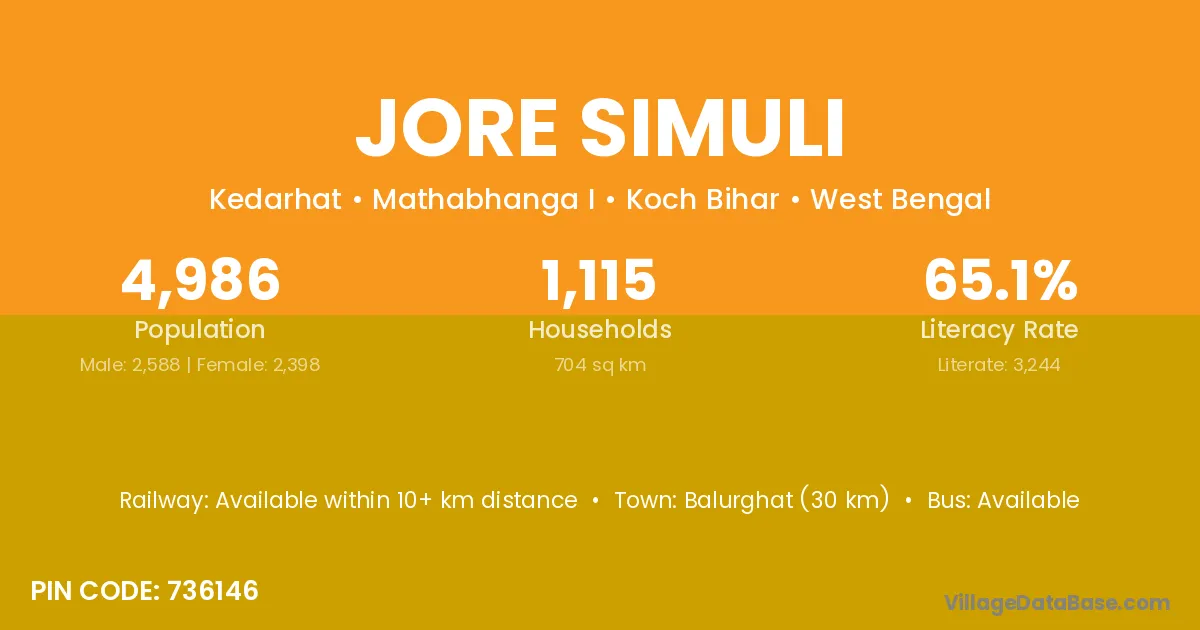 Balurghat (30 km) is the nearest town to Jore Simuli village for major economic activities and is located approximately 30 km away.