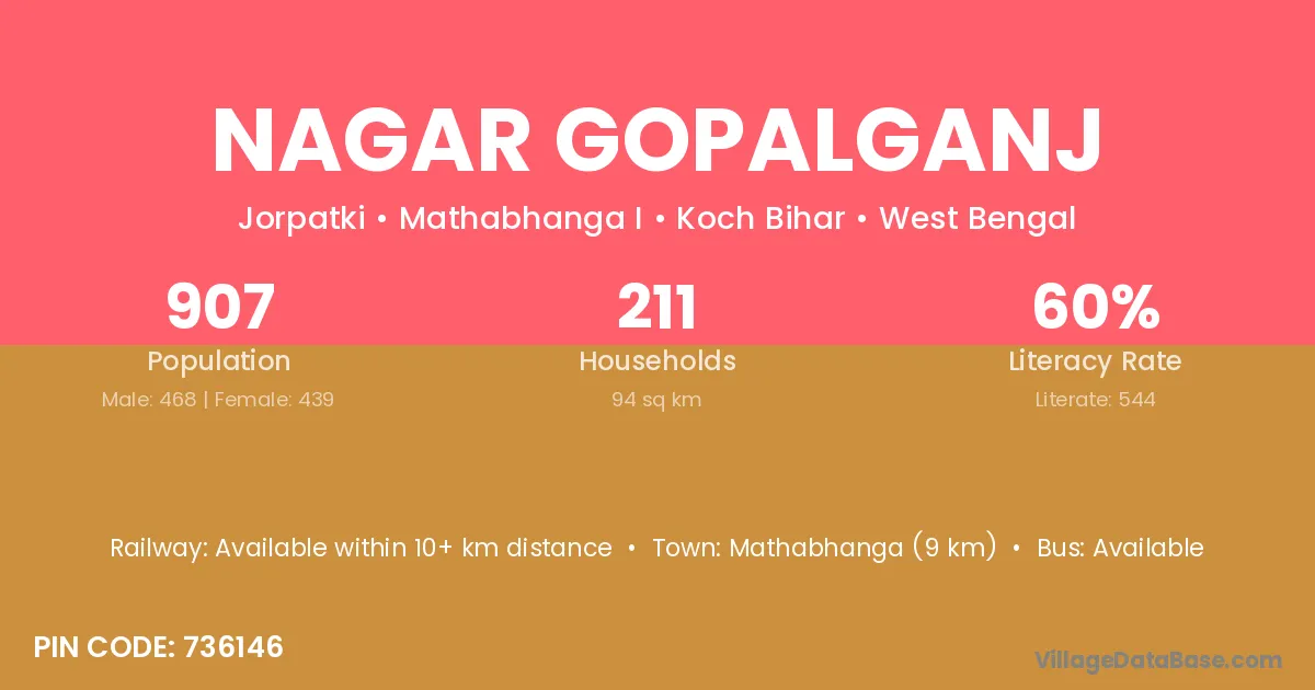 Mathabhanga (9 km) is the nearest town to Nagar Gopalganj village for major economic activities and is located approximately 9 km away.
