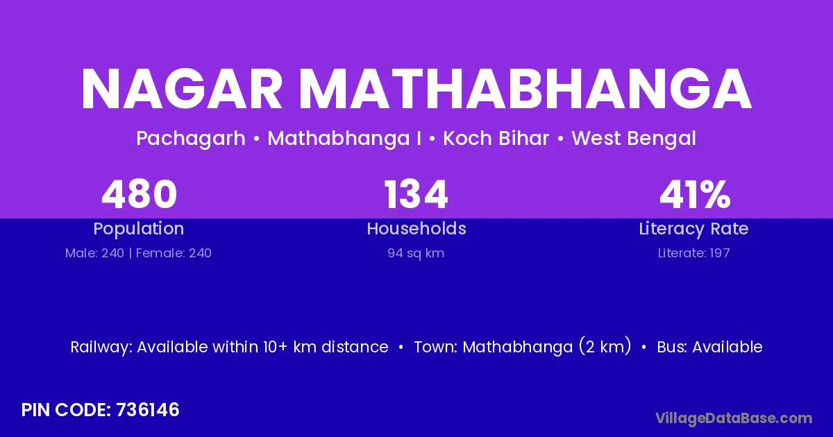 Nagar Mathabhanga village has a total population of 480 people, of which 240 are males and 240 are females.
