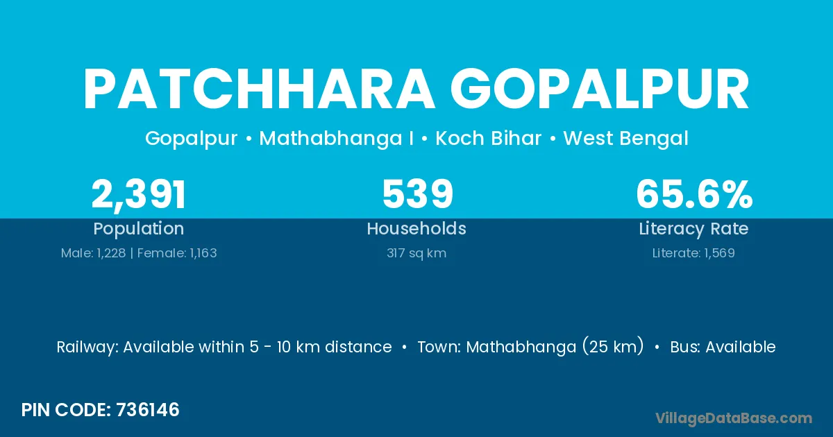 Mathabhanga (25 km) is the nearest town to Patchhara Gopalpur village for major economic activities and is located approximately 25 km away.