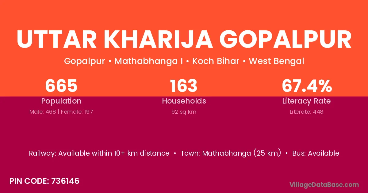 Mathabhanga (25 km) is the nearest town to Uttar Kharija Gopalpur village for major economic activities and is located approximately 25 km away.