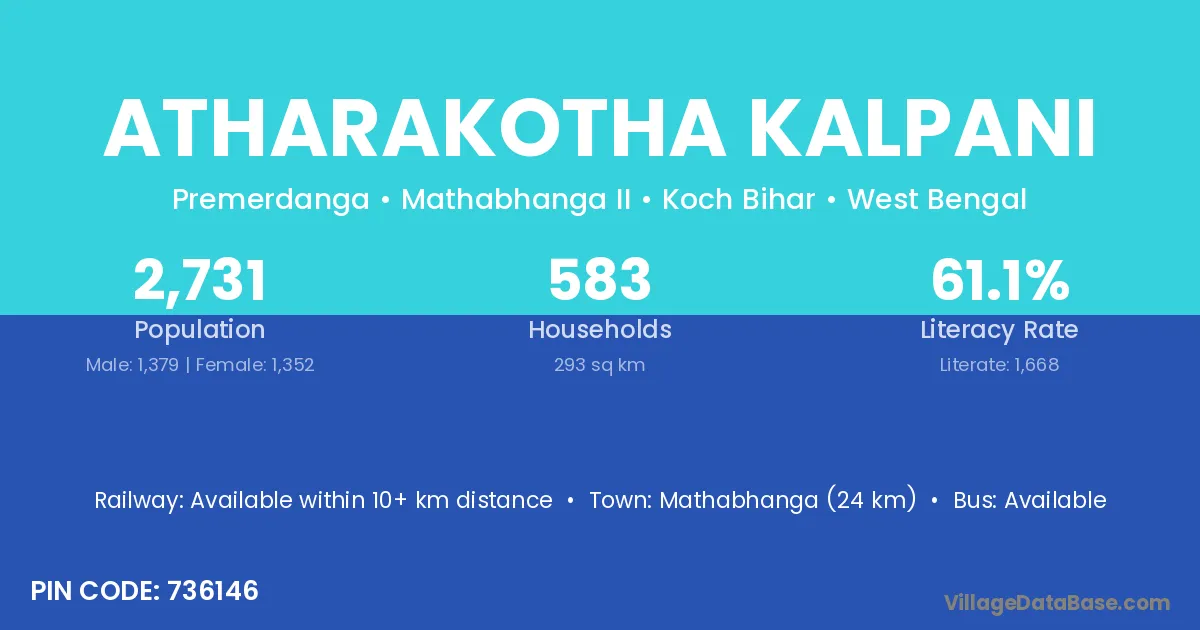 Mathabhanga (24 km) is the nearest town to Atharakotha Kalpani village for major economic activities and is located approximately 24 km away.
