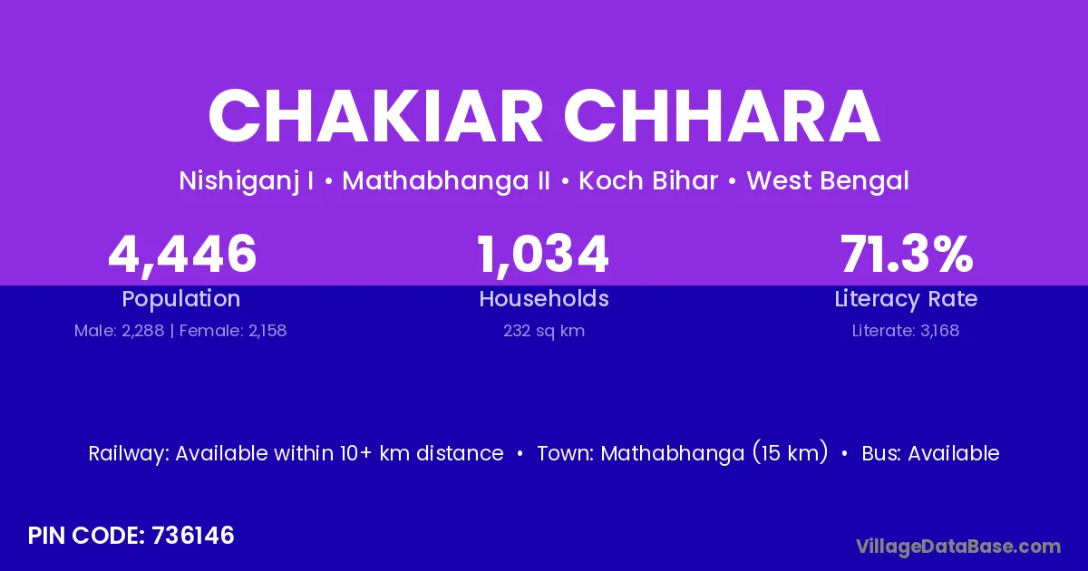 Mathabhanga (15 km) is the nearest town to Chakiar Chhara village for major economic activities and is located approximately 15 km away.