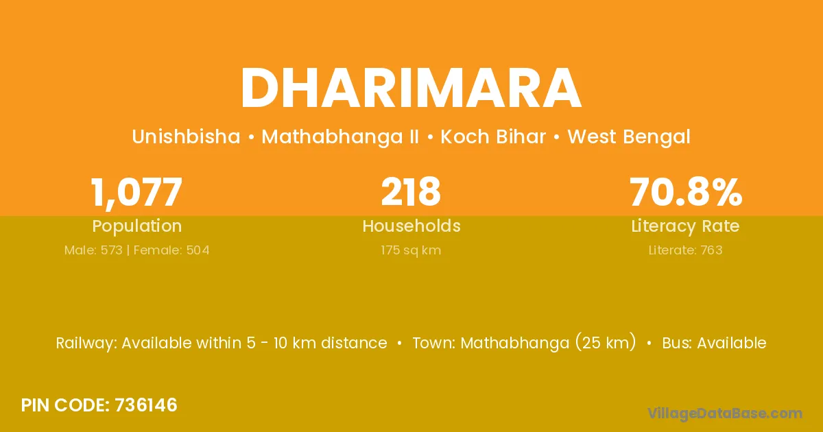 Mathabhanga (25 km) is the nearest town to Dharimara village for major economic activities and is located approximately 25 km away.