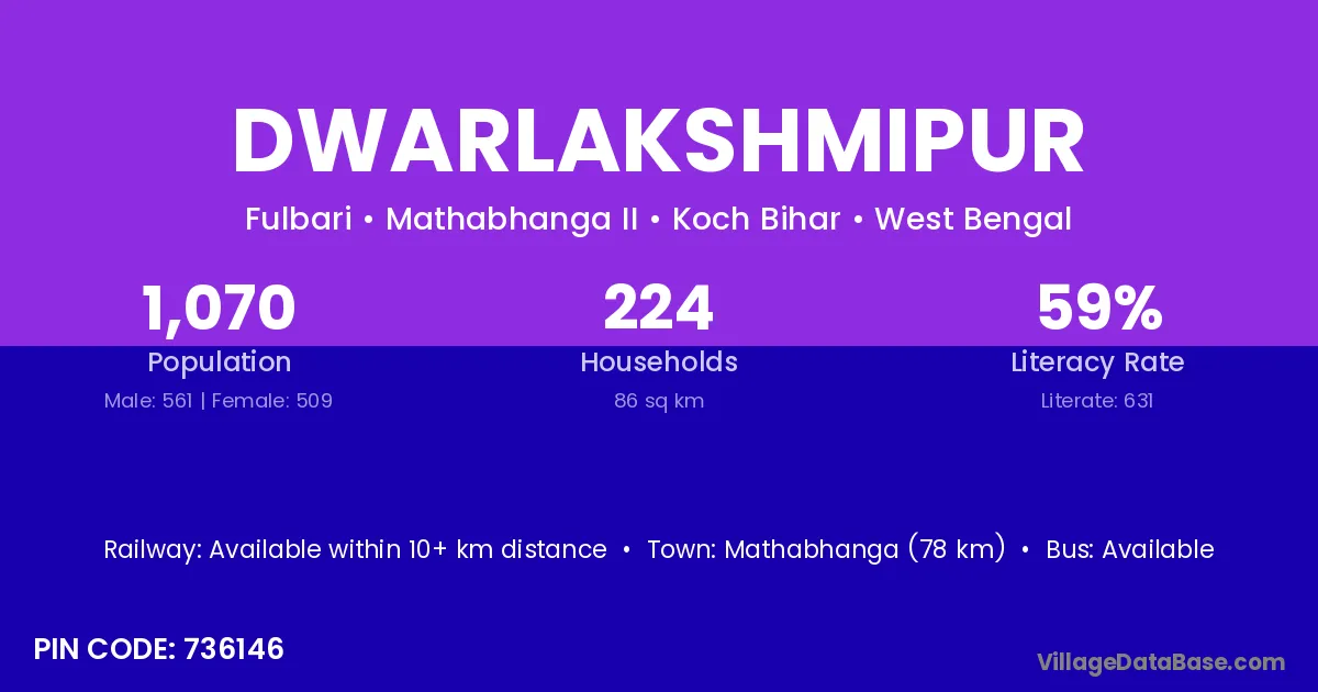 Mathabhanga (78 km) is the nearest town to Dwarlakshmipur village for major economic activities and is located approximately 78 km away.