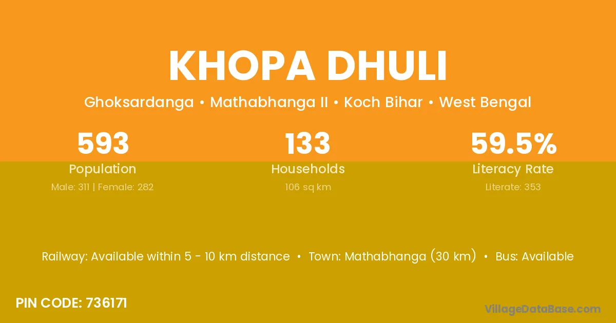 Mathabhanga (30 km) is the nearest town to Khopa Dhuli village for major economic activities and is located approximately 30 km away.