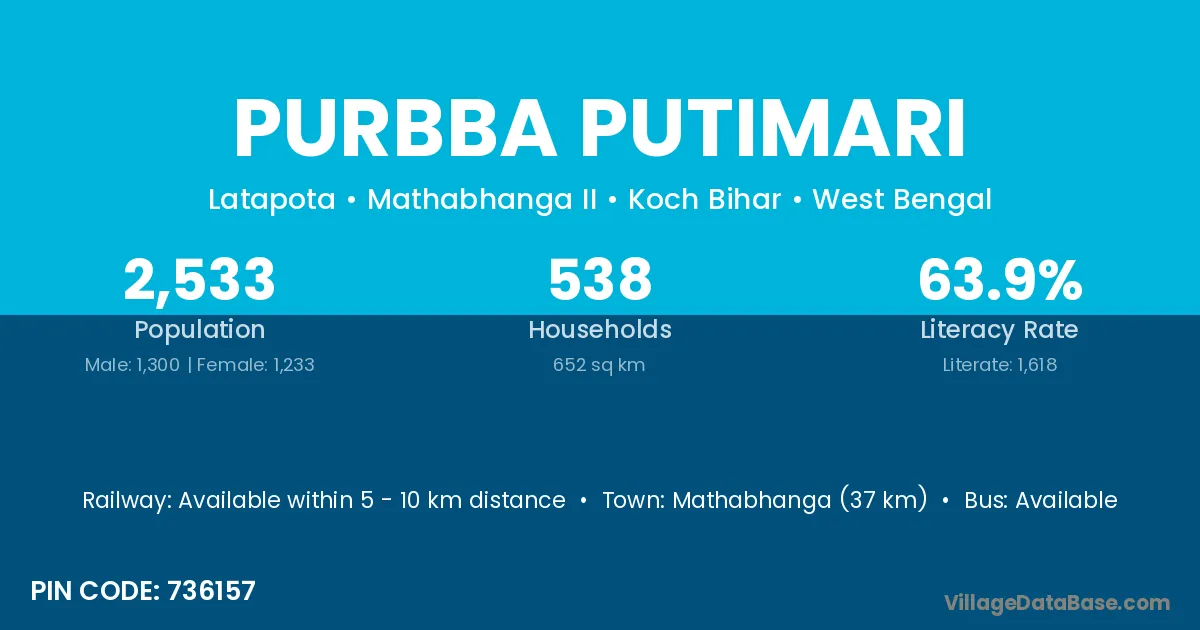 Mathabhanga (37 km) is the nearest town to Purbba Putimari village for major economic activities and is located approximately 37 km away.