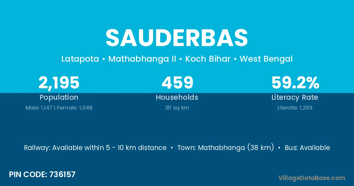 Mathabhanga (38 km) is the nearest town to Sauderbas village for major economic activities and is located approximately 38 km away.