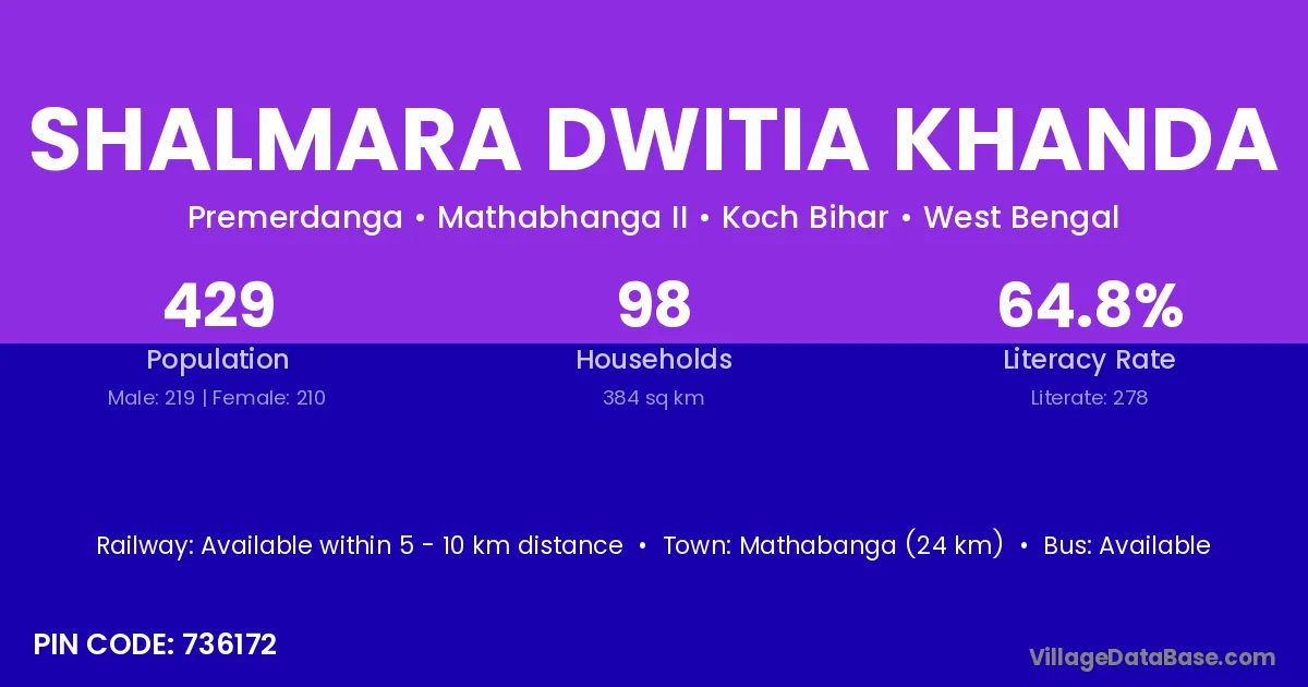 According to Census 2011 information, the village code of Shalmara Dwitia Khanda village is 736172.