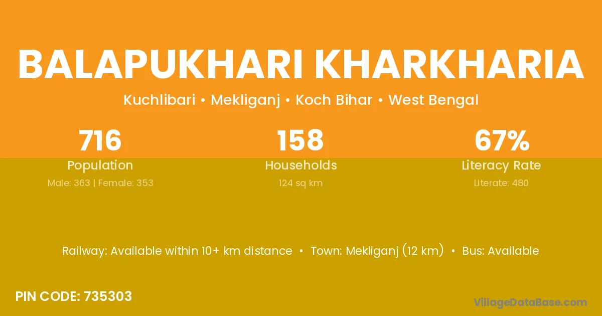 Balapukhari Kharkharia village has a total population of 716 people, of which 363 are males and 353 are females.