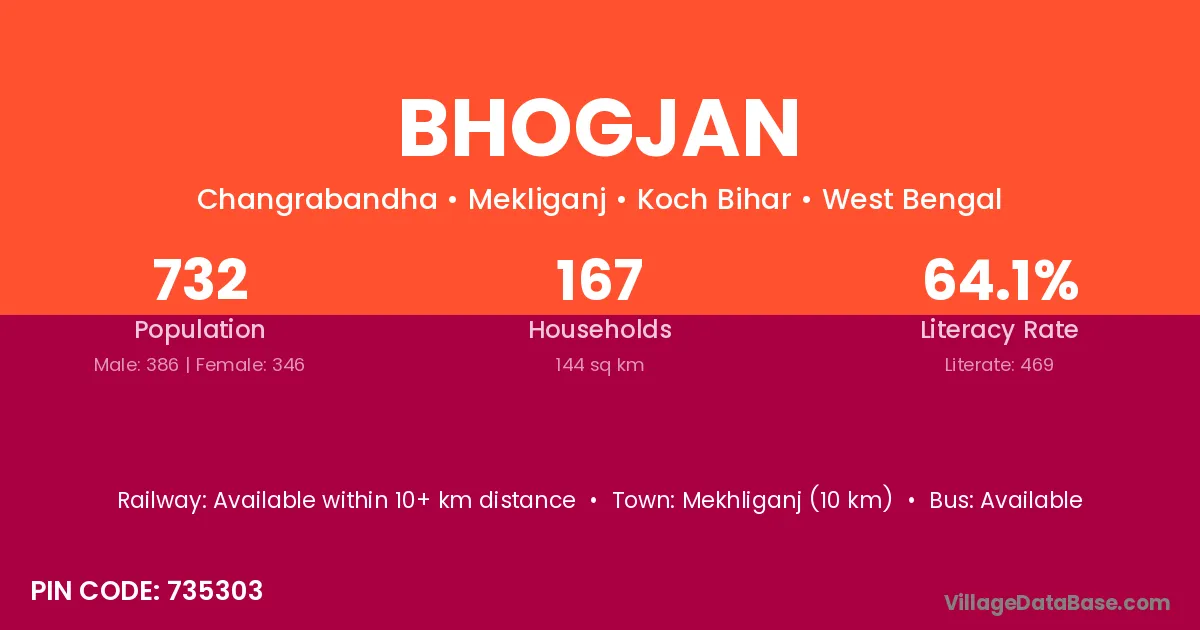 Mekhliganj (10 km) is the nearest town to Bhogjan village for major economic activities and is located approximately 10 km away.