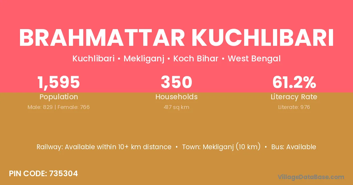 Brahmattar Kuchlibari village has a total population of 1,595 people, of which 829 are males and 766 are females.