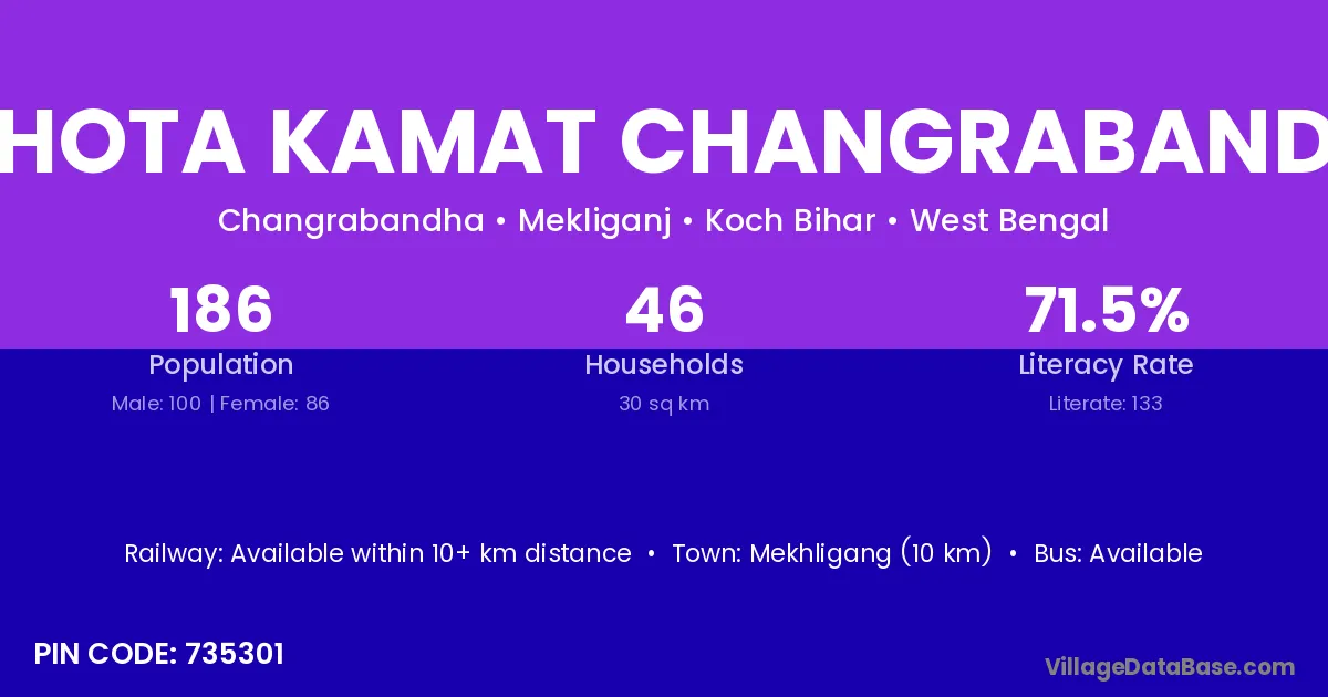 Mekhligang (10 km) is the nearest town to Chhota Kamat Changrabandha village for major economic activities and is located approximately 10 km away.