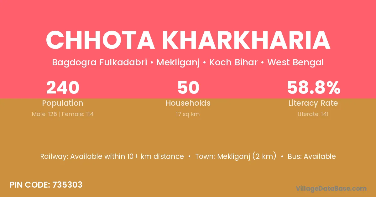 Mekliganj (2 km) is the nearest town to Chhota Kharkharia village for major economic activities and is located approximately 2 km away.