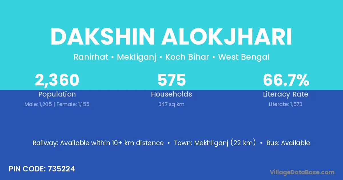Dakshin Alokjhari village has a total population of 2,360 people, of which 1,205 are males and 1,155 are females.