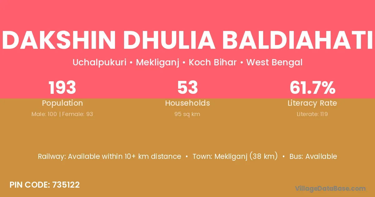 Dakshin Dhulia Baldiahati village has a total population of 193 people, of which 100 are males and 93 are females.