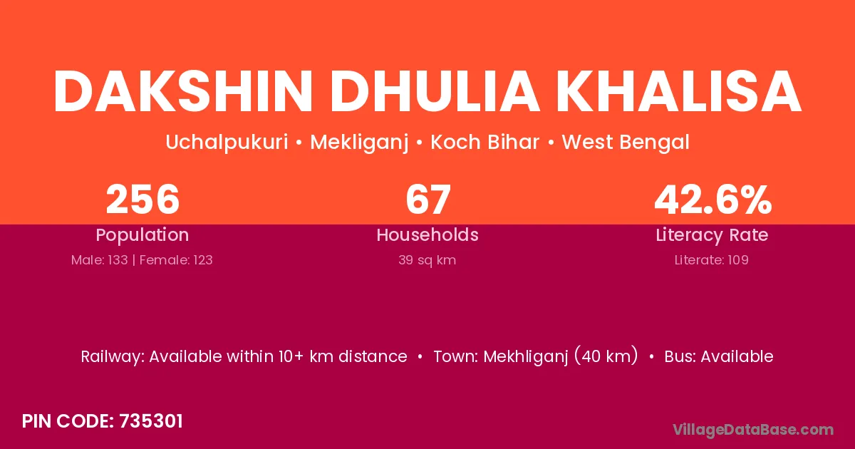 Mekhliganj (40 km) is the nearest town to Dakshin Dhulia Khalisa village for major economic activities and is located approximately 40 km away.