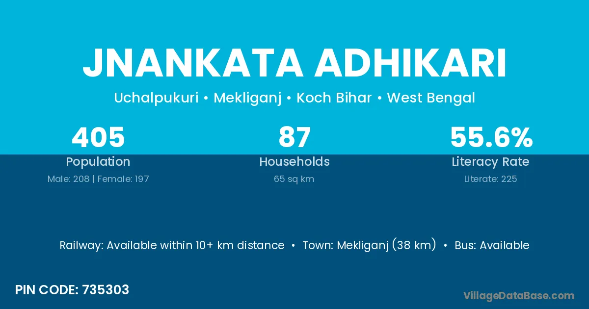 Jnankata Adhikari village has a total population of 405 people, of which 208 are males and 197 are females.