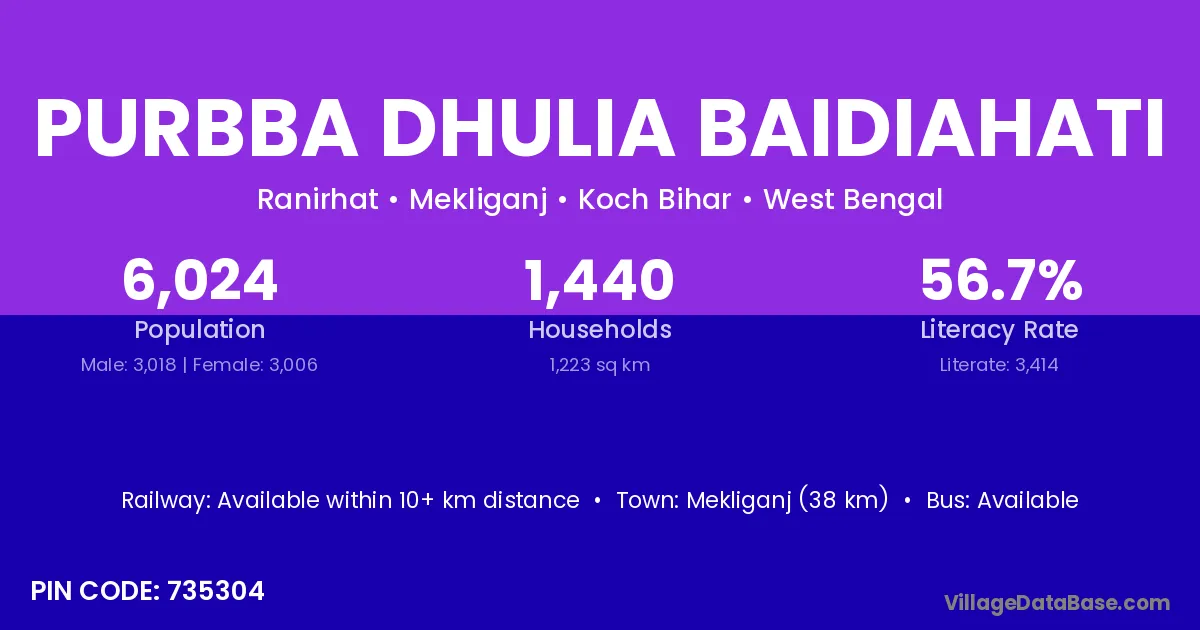 Mekliganj (38 km) is the nearest town to Purbba Dhulia Baidiahati village for major economic activities and is located approximately 38 km away.