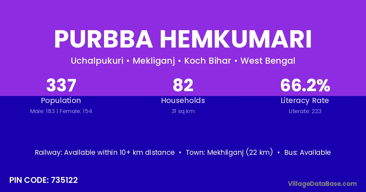 Mekhliganj (22 km) is the nearest town to Purbba Hemkumari village for major economic activities and is located approximately 22 km away.