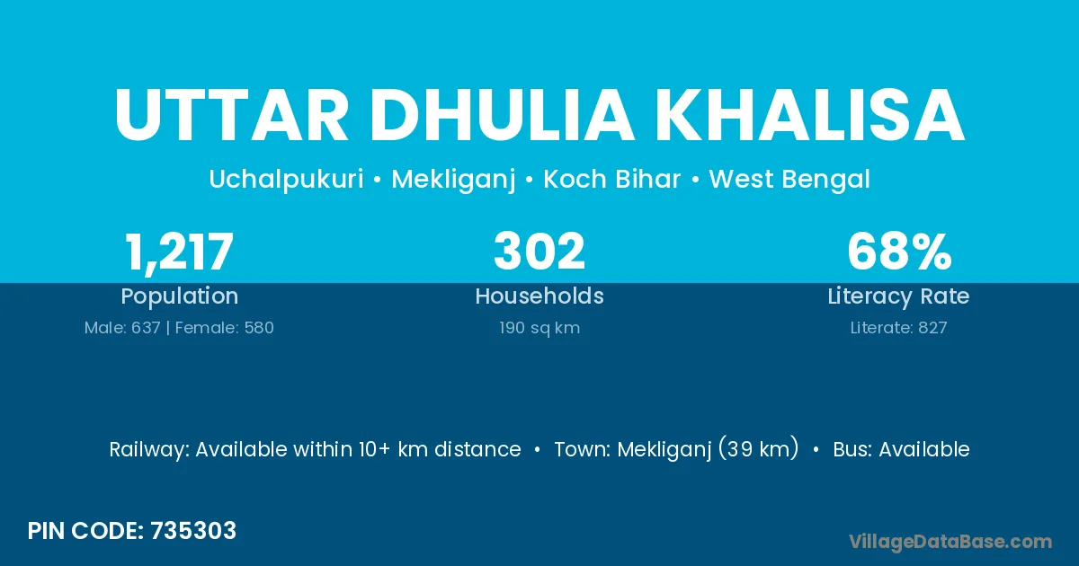 Mekliganj (39 km) is the nearest town to Uttar Dhulia Khalisa village for major economic activities and is located approximately 39 km away.