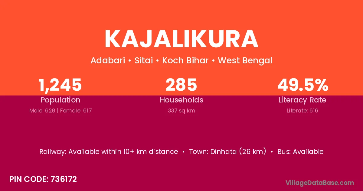 Dinhata (26 km) is the nearest town to Kajalikura village for major economic activities and is located approximately 26 km away.