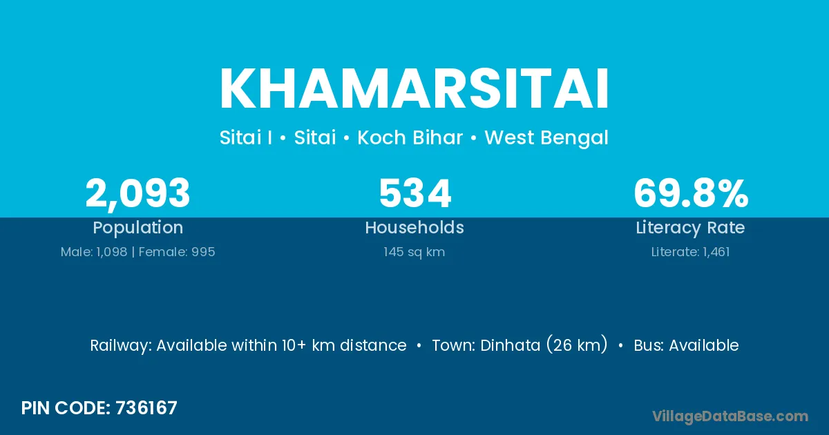 Dinhata (26 km) is the nearest town to Khamarsitai village for major economic activities and is located approximately 26 km away.