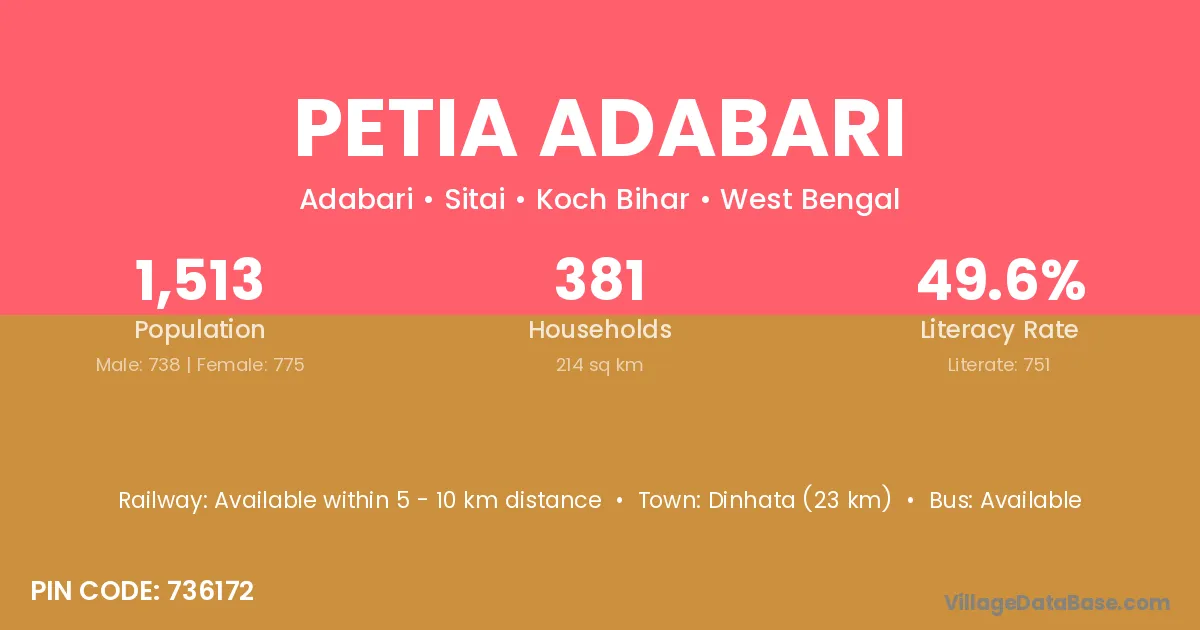 Dinhata (23 km) is the nearest town to Petia Adabari village for major economic activities and is located approximately 23 km away.