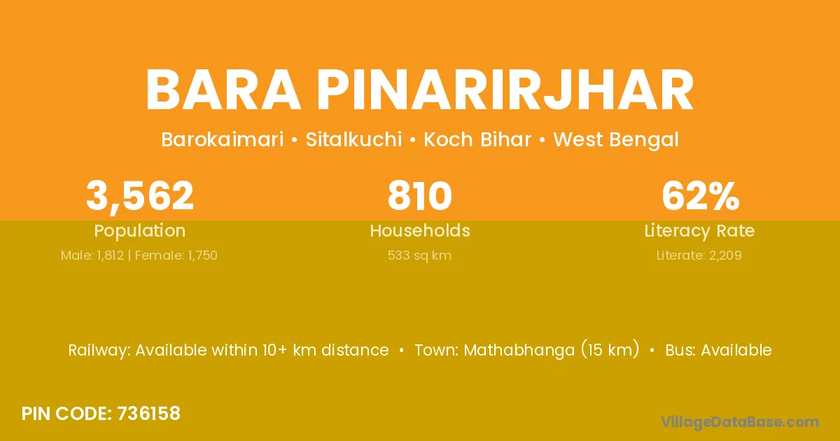 Mathabhanga (15 km) is the nearest town to Bara Pinarirjhar village for major economic activities and is located approximately 15 km away.