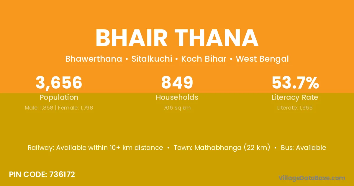 Mathabhanga (22 km) is the nearest town to Bhair Thana village for major economic activities and is located approximately 22 km away.
