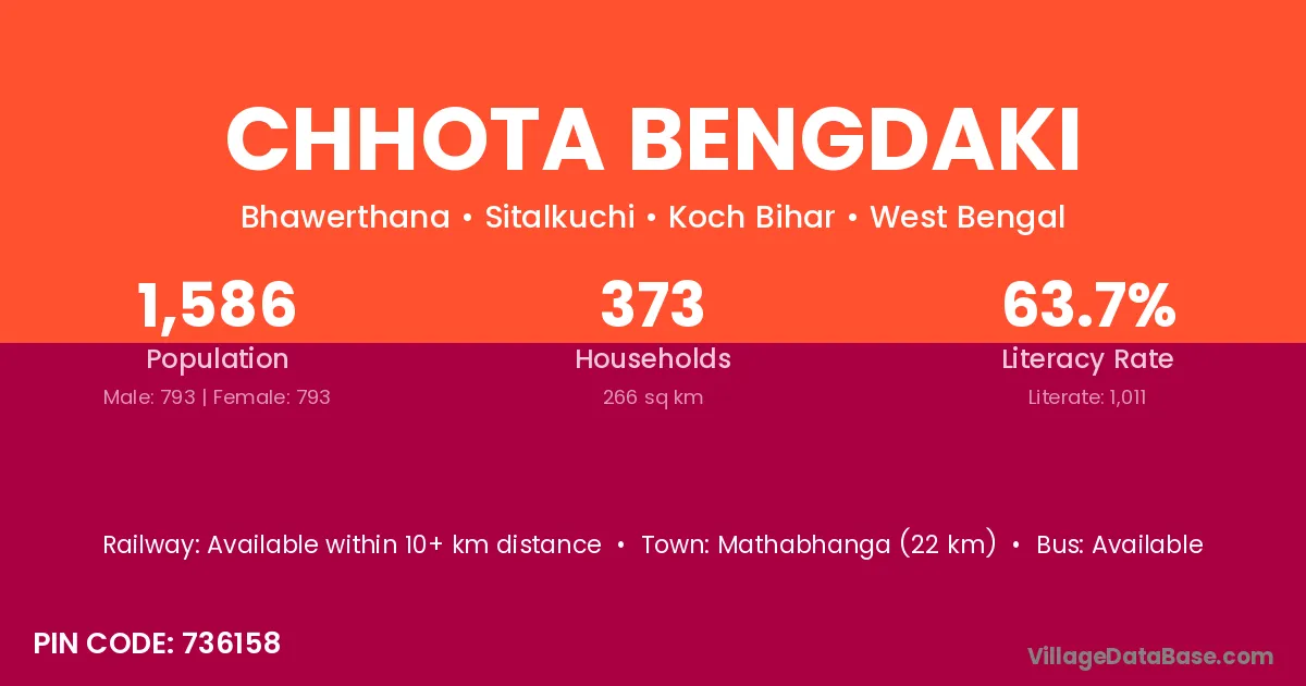 Chhota Bengdaki village has a total population of 1,586 people, of which 793 are males and 793 are females.
