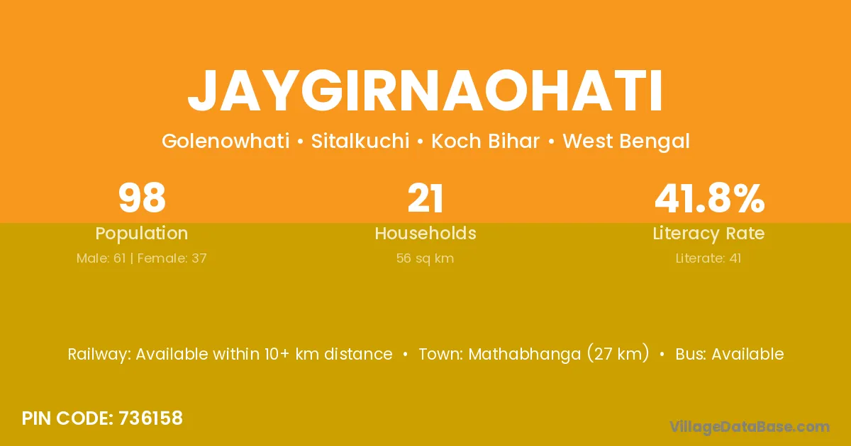 Mathabhanga (27 km) is the nearest town to Jaygirnaohati village for major economic activities and is located approximately 27 km away.