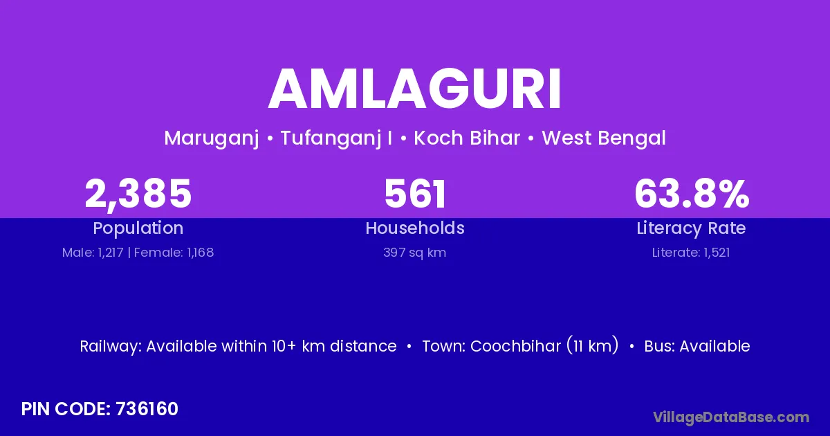 Coochbihar (11 km) is the nearest town to Amlaguri village for major economic activities and is located approximately 11 km away.