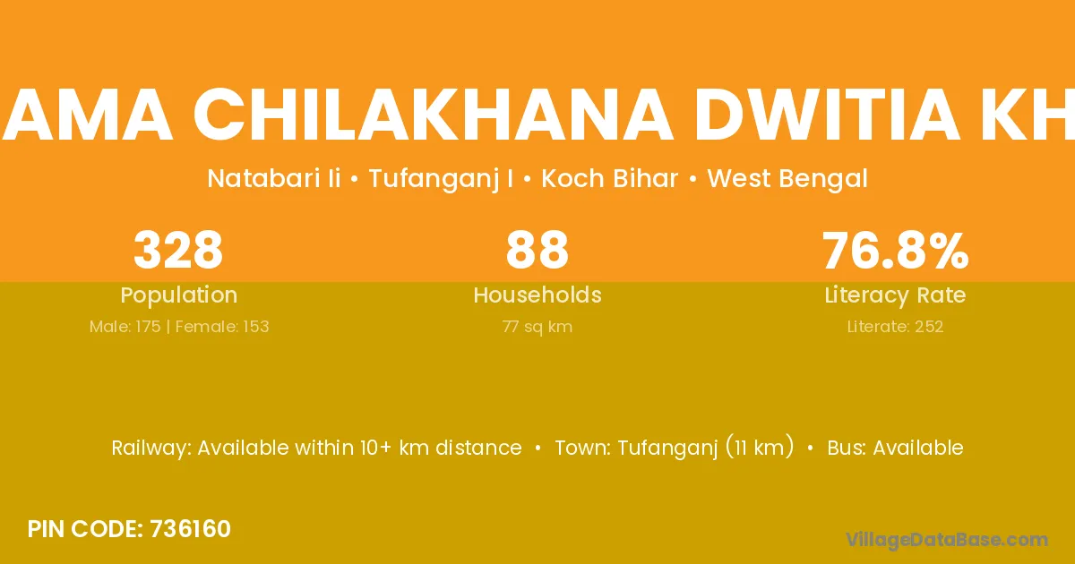 Tufanganj (11 km) is the nearest town to Bajejama Chilakhana Dwitia Khanda village for major economic activities and is located approximately 11 km away.