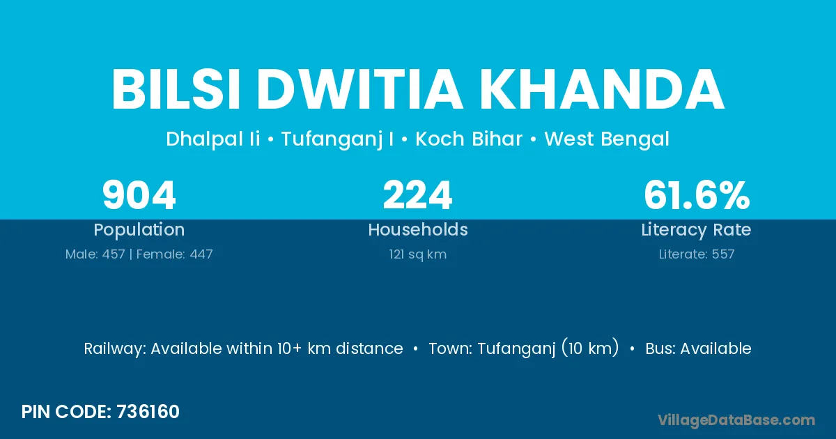 Tufanganj (10 km) is the nearest town to Bilsi Dwitia Khanda village for major economic activities and is located approximately 10 km away.