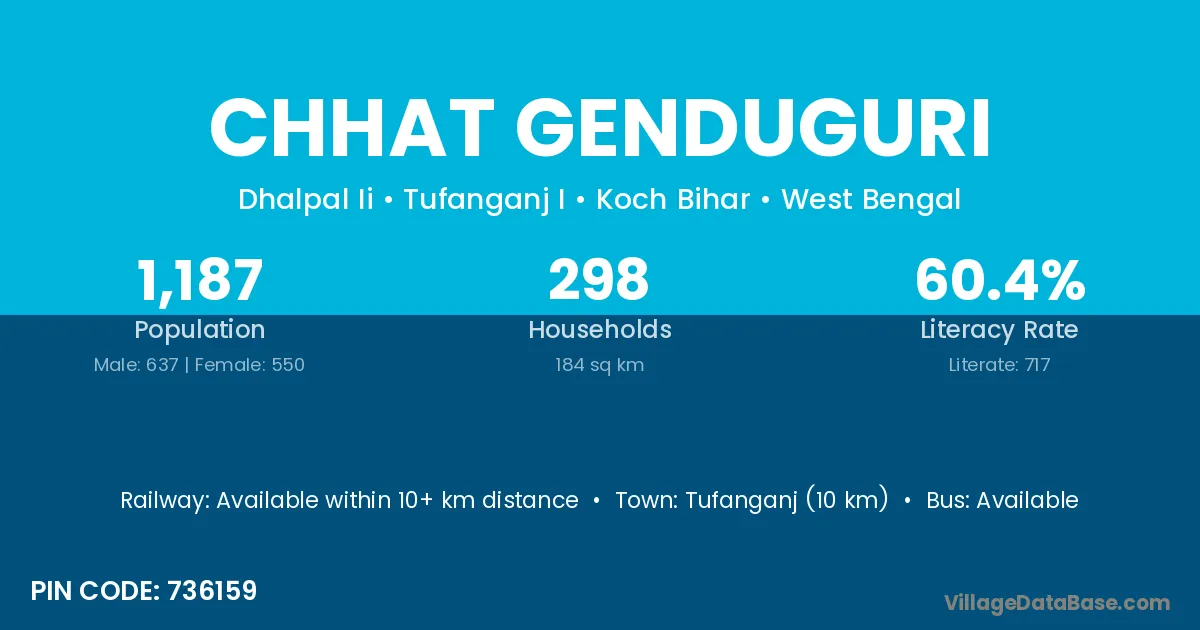 Tufanganj (10 km) is the nearest town to Chhat Genduguri village for major economic activities and is located approximately 10 km away.