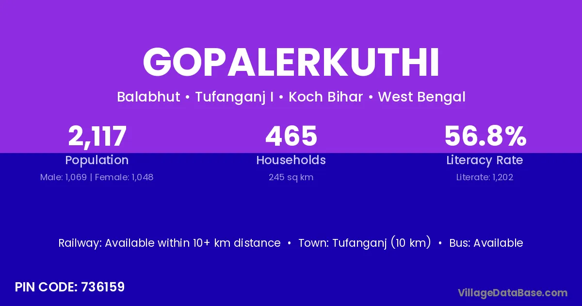 Gopalerkuthi village has a total population of 2,117 people, of which 1,069 are males and 1,048 are females.