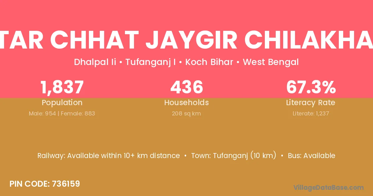 Tufanganj (10 km) is the nearest town to Uttar Chhat Jaygir Chilakhana village for major economic activities and is located approximately 10 km away.