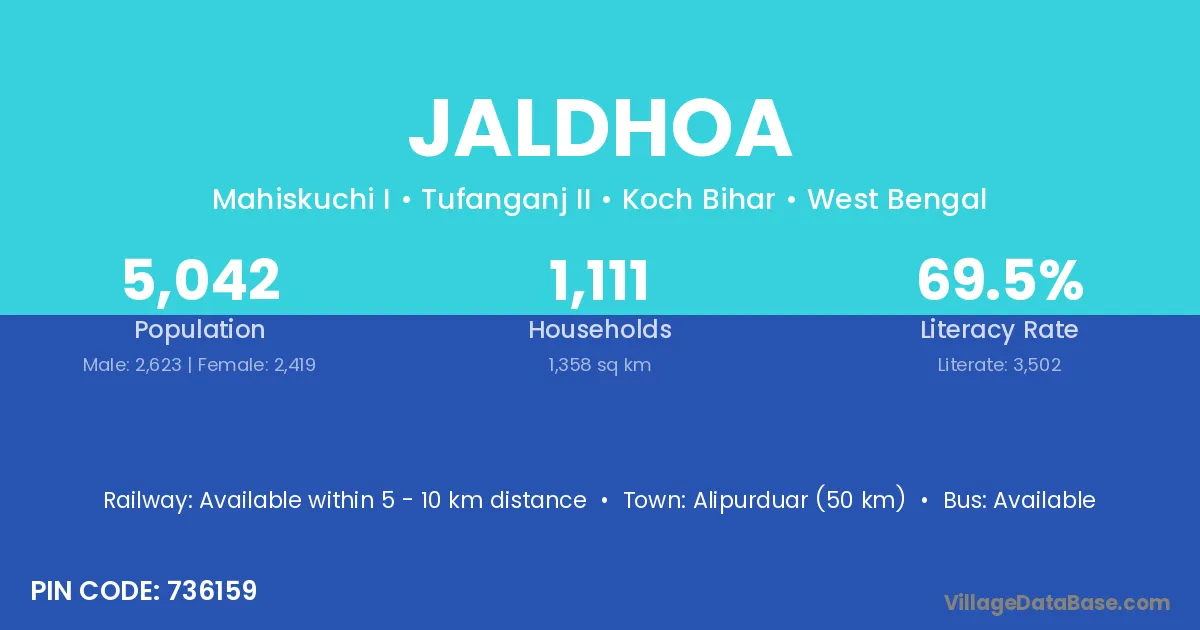 Alipurduar (50 km) is the nearest town to Jaldhoa village for major economic activities and is located approximately 50 km away.