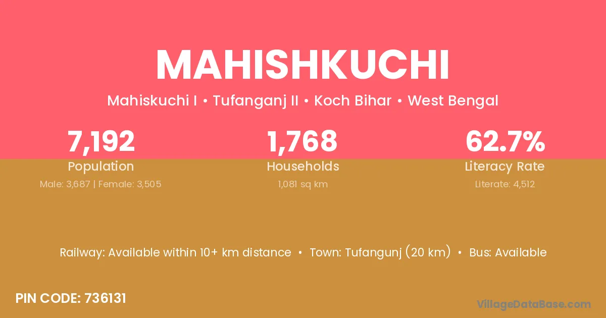 Tufangunj (20 km) is the nearest town to Mahishkuchi village for major economic activities and is located approximately 20 km away.